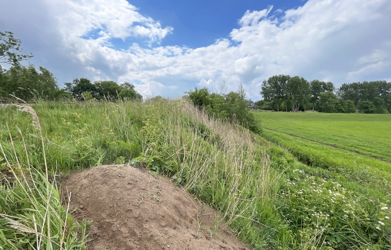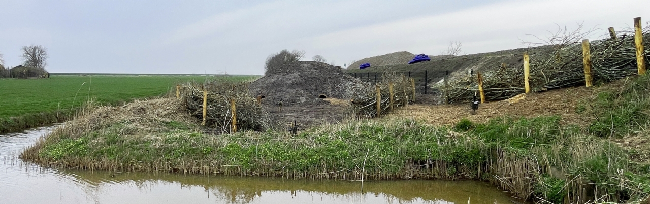 Bij deze kunstburcht naast het spoor bij Molkwerum is de dekking effectief hersteld met takkenbossen ingeklemd tussen weilandpaaltjes