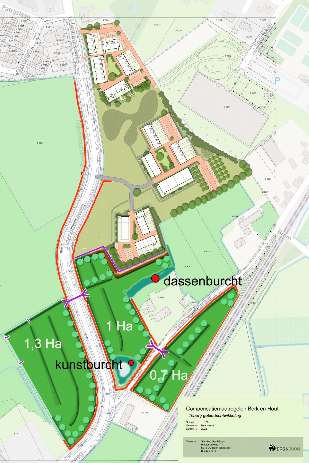 Voorbeeld van een compensatieplan die ik namens Das&Boom ontwikkeld heb voor een woningbouwproject in Udenhout. Een dassenburcht aan de rand van het plangebied kan zou blijven functioneren, effectief gescheiden van de woningbouwplannen, die een eindje moesten verschuiven