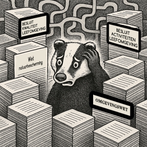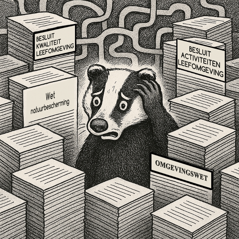 | | Omgevingswet De Omgevingswet stelt in de algemene bepalingen, met name in de artikelen die de zorgplicht voor een gezonde, veilige en duurzame leefomgeving vastleggen (bijvoorbeeld artikel 1.2 en 1.3), de basis voor natuurbescherming. Hierin is ook verankerd dat de biodiversiteit – en dus ook de bescherming van beschermde diersoorten zoals de das – gewaarborgd moet worden. De uitvoering en invulling hiervan wordt nader uitgewerkt in aanvullende regelgeving en uitvoeringsbesluiten.