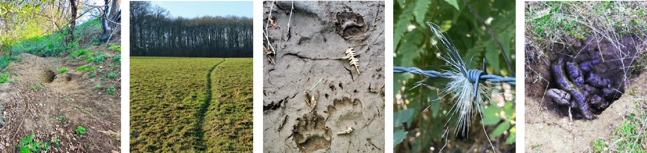 Een van de meest opvallende aanwijzingen van zijn aanwezigheid zijn de dassenburchten. Die liggen in veruit de meeste gevallen buiten de bebouwde kom. Deze burchten vind je niet gemakkelijk, omdat de das daarvoor vaak begroeide en rustig gelegen plekken kiest. Wel kun je, als je weet waar je op moet letten, andere sporen ontdekken. Zo zijn er de zogenaamde wissels: vaste paden die de das in zijn territorium volgt. Wanneer deze paden onder prikkeldraad worden doorkruist, kan er soms een bundeltje karakteristieke dassenharen – zwart-wit van kleur – achterblijven. Een duidelijke pootafdruk is een onmiskenbaar spoor dat wijst op de aanwezigheid van een das. Daarnaast zijn er de zogenaamde mestputjes: kleine, ondiepe kuiltjes waar de das zijn behoefte doet. Deze mestputjes spelen een cruciale rol in de geurwereld van dassen, omdat een andere das erdoor kan achterhalen of het gaat om een familielid.