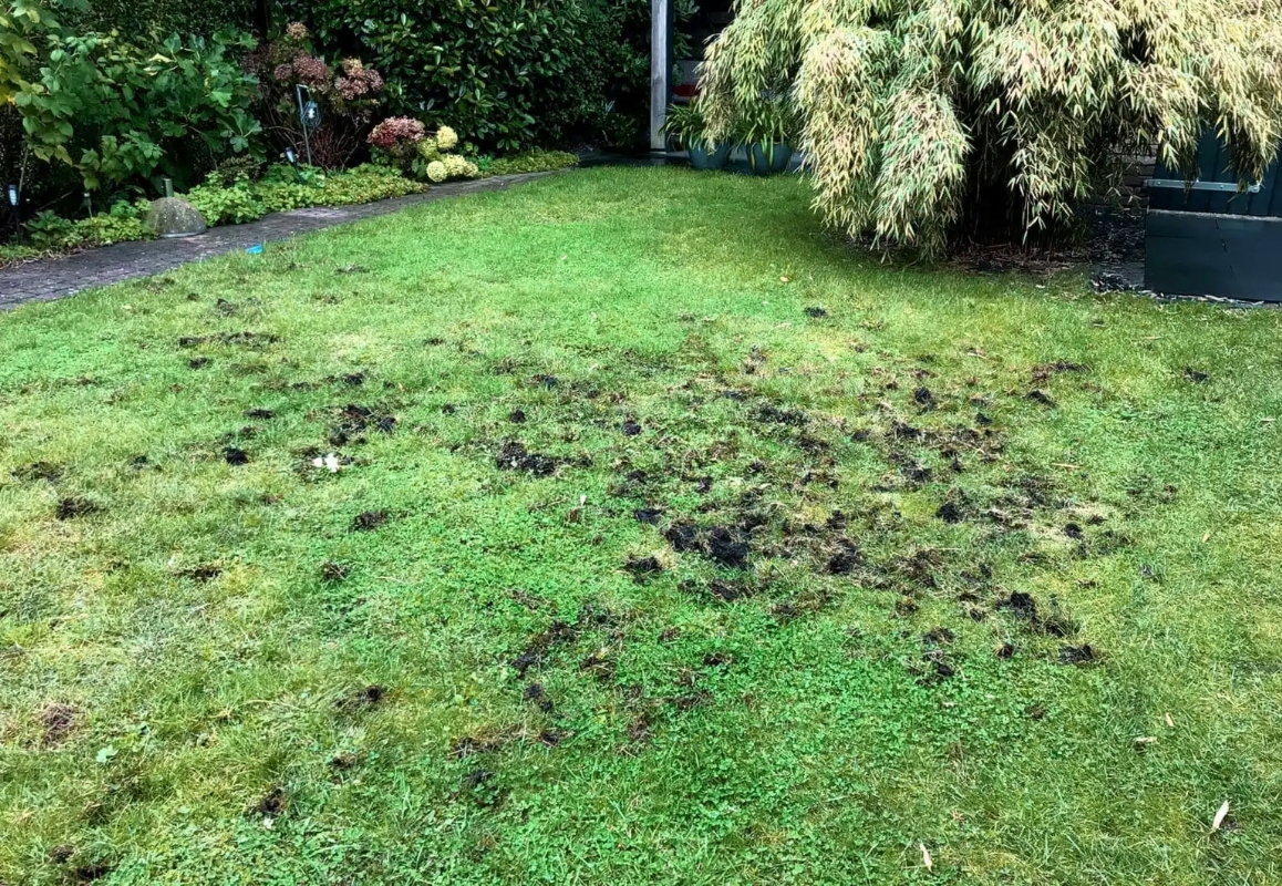 Op dit grafveld heeft de das naar engerlingen en emelten gezocht, voornamelijk op de gele plekken, waar die insectenlarven al een tijdje aan de graswortels geknabbeld hebben